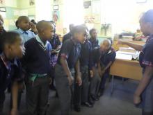 Grade 5B learners practising a song and dance item. The item took place in class under the guidance of the conductor, Naledi Mahapeletja, a Grade 5  learner. They enjoyed the experience of taking direction from one of their peers.
