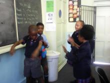 Grade 4 learners dramatising a story of a learner who is been bullied by another learner and the girls came to rescue him.